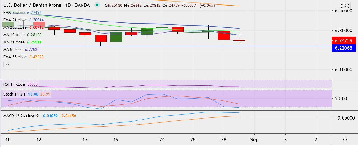 FxWirePro: USD/DKK near 2-week trough, dip till 6.2204 likely