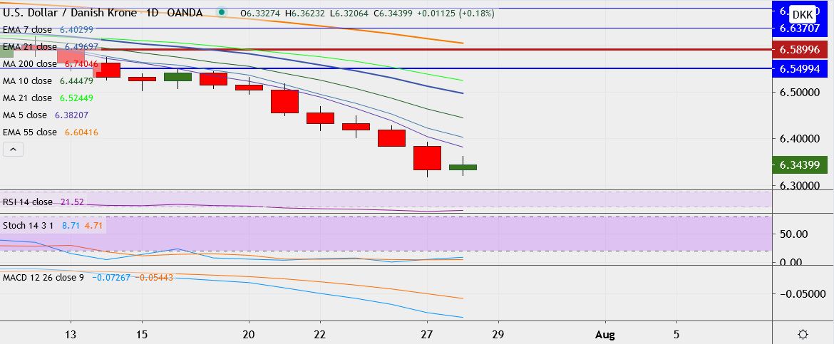 - USD/DKK is trading 0.2 up at 6.3434, having hit low of 6.3177 the day before, its lowest since September 2018.