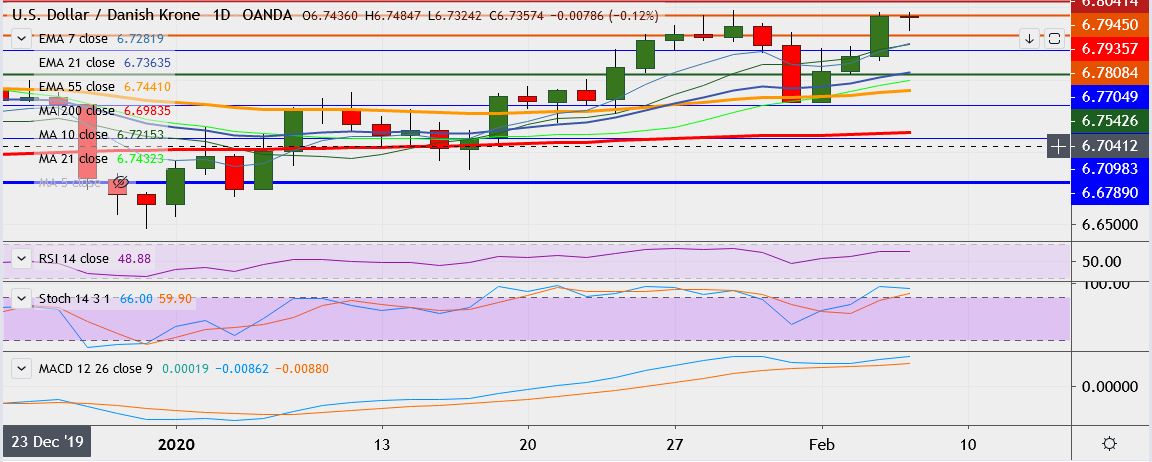 - USD/DKK is currently trading 0.05 percent down at 6.7926, having hit high of 6.7971 earlier, its highest since Jan. 30.