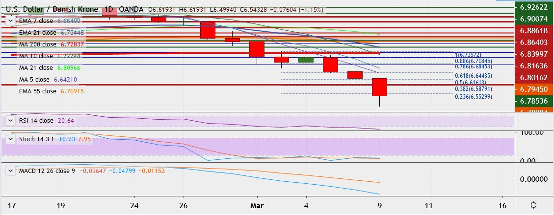 - USD/DKK is trading 1.1 percent down at 6.5464, having hit low of 6.4994 earlier, its lowest since January 2019.