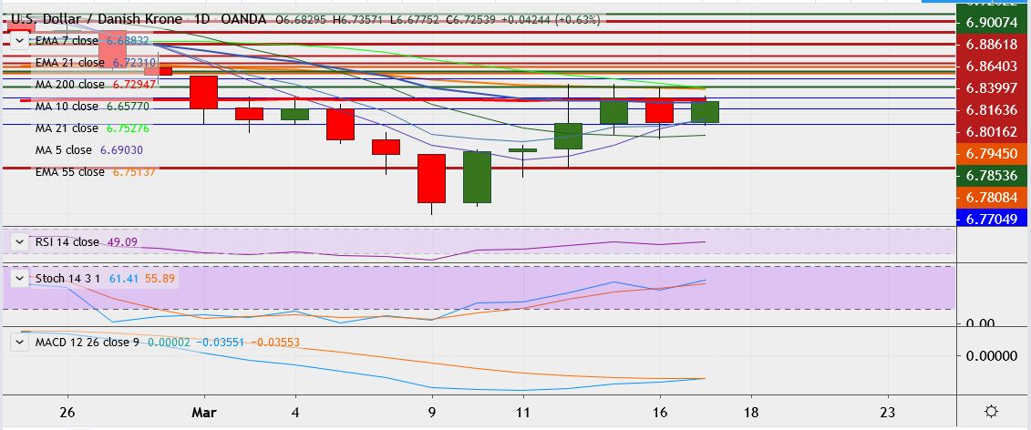 - USD/DKK is trading 0.7 percent up at 6.7334, having hit high of 6.7604 on Friday, its highest since March 2.