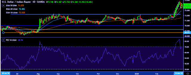 We prefer to take long position on USD/INR around 74.00, stop loss at 73.74 and target of 75.10.