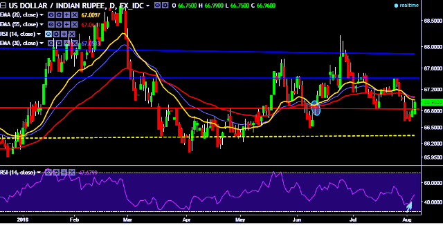 We prefer to take long position in USD/INR only above 67.05, stop loss at 66.82 and target of 67.32.