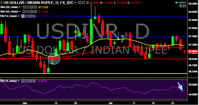 We prefer to take short position in USD/INR only below 66.99, stop loss at 67.34 and target of 66.85/66.50.