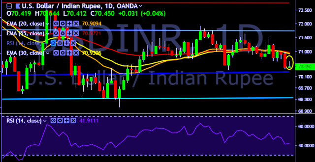 We prefer to take short position on USD/INR only below 70.40, stop loss at 70.70 and target of 70.08.