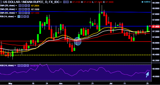 We prefer to take long position in USD/INR only above 67.42, stop loss at 66.17 and target of 67.71/67.84.