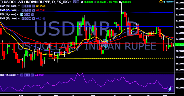 We prefer to take long position in USD/INR only above 66.86, stop loss at 66.62 and target of 67.32.