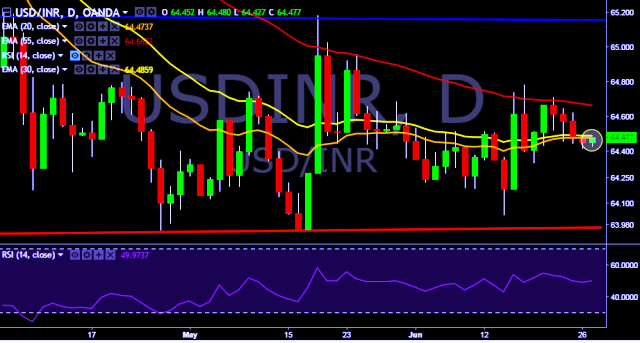 We prefer to take short position in USD/INR only below 64.42, stop loss at 64.55 and target of 64.27/64.18.
