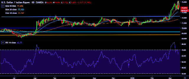 - It made intraday high at 74.99 and low at 73.74 marks.