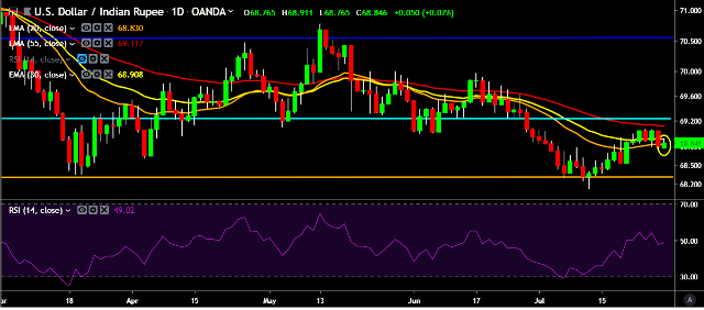 - USD/INR is currently trading around 68.85 marks.