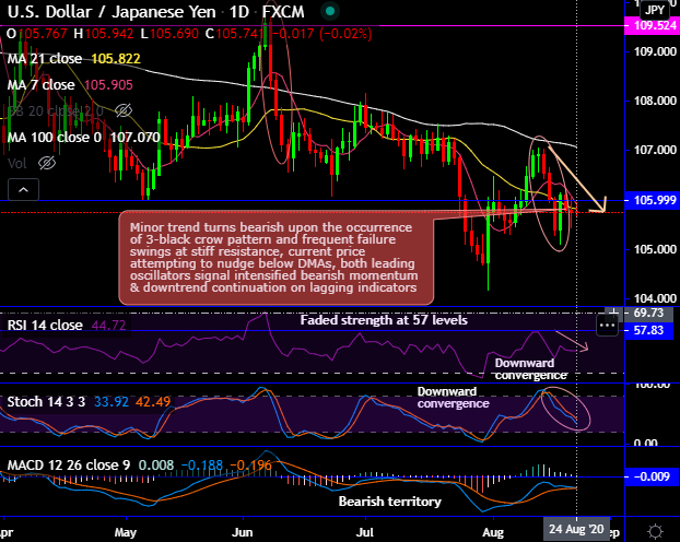 Minor trend turns bearish upon the occurrence of 3-black crow pattern at 105.401 levels and frequent failure swings at stiff resistance (refer daily chart), the current price attempting to nudge below DMAs. While both leading oscillators signal intensified bearish momentum and downtrend continuation on lagging indicators.