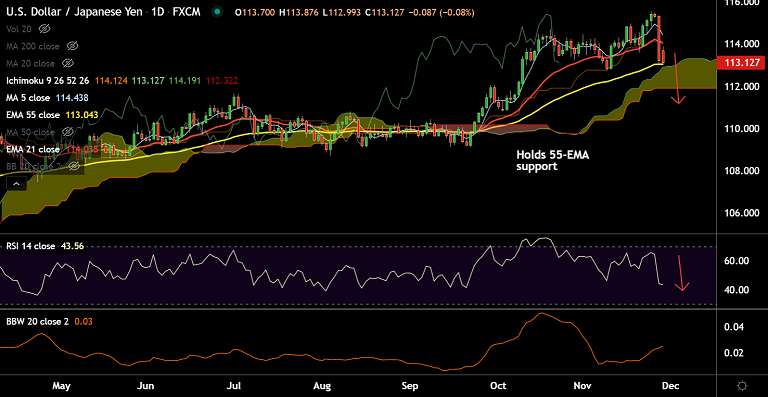Summary: USD/JPY is holding support at 55-EMA, break below will drag the pair lower. Technical bias is bearish on the intraday charts.
