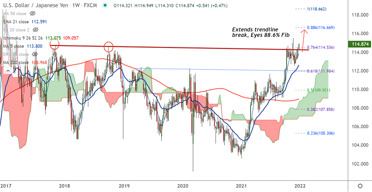 Major Support Levels: 114.50 (5-DMA), 114.01 (21-EMA), 113.89 (Nearly converged cloud and 50-DMA)