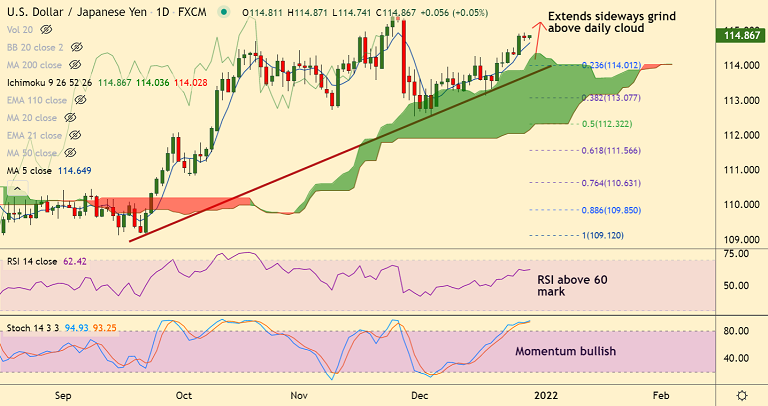 Summary: USD/JPY is extending sideways for the second consecutive session, but technical bias remains bullish. Scope for test of 115 levels.