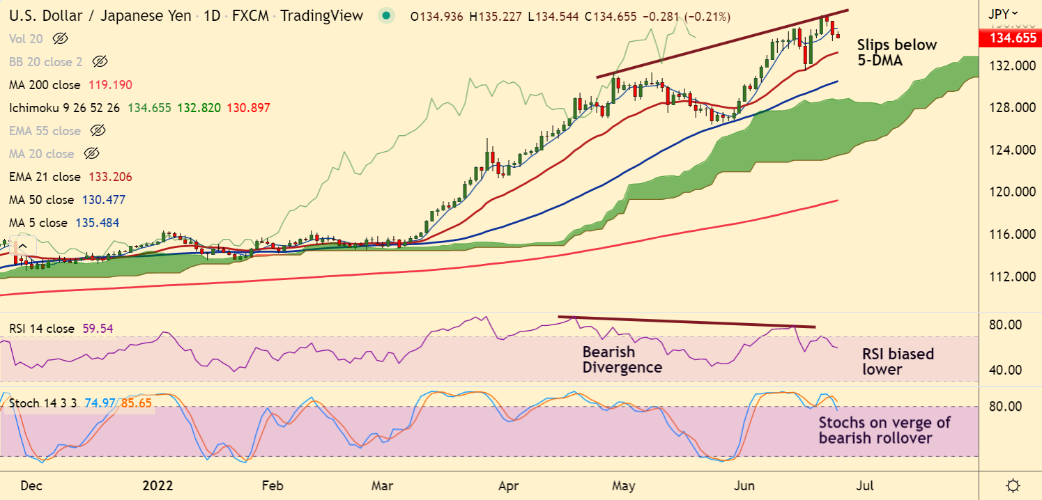 Price action has slipped below 5-DMA and is on track to test 21-EMA support at 133.21.