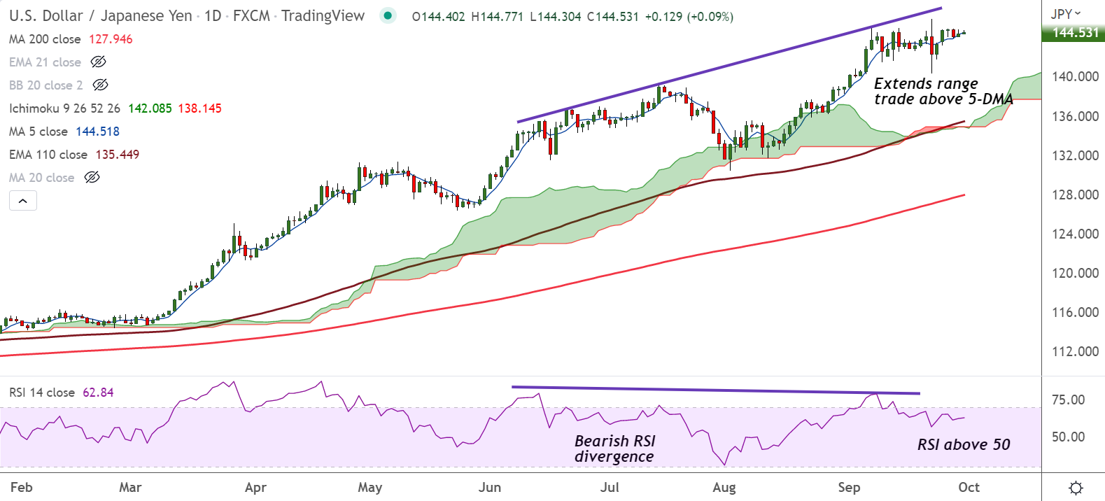 The pair is extending sideways grind, hovers around 5-DMA. Major trend remains bullish.
