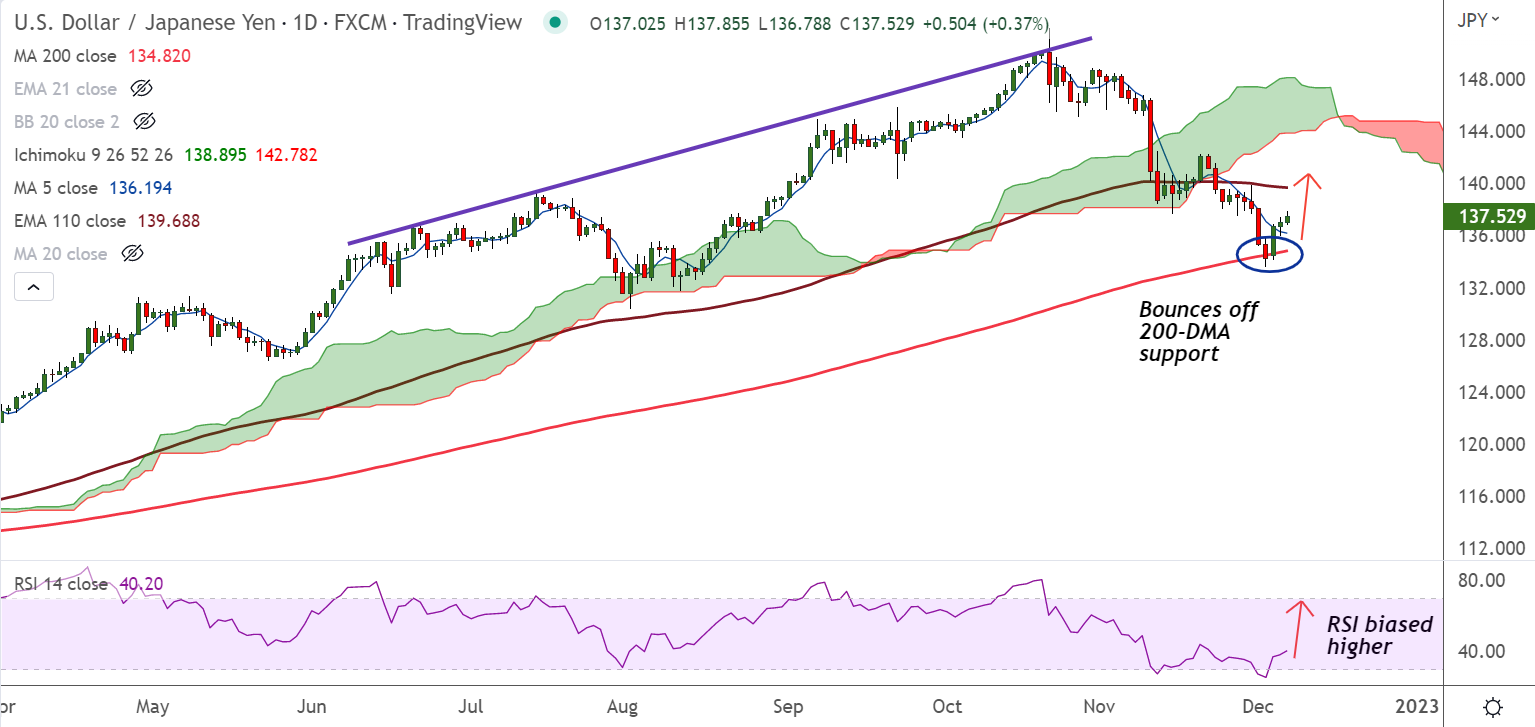 USD/JPY has paused downside at 200-DMA support, price has edged above 5-DMA, hovers above 200H MA.