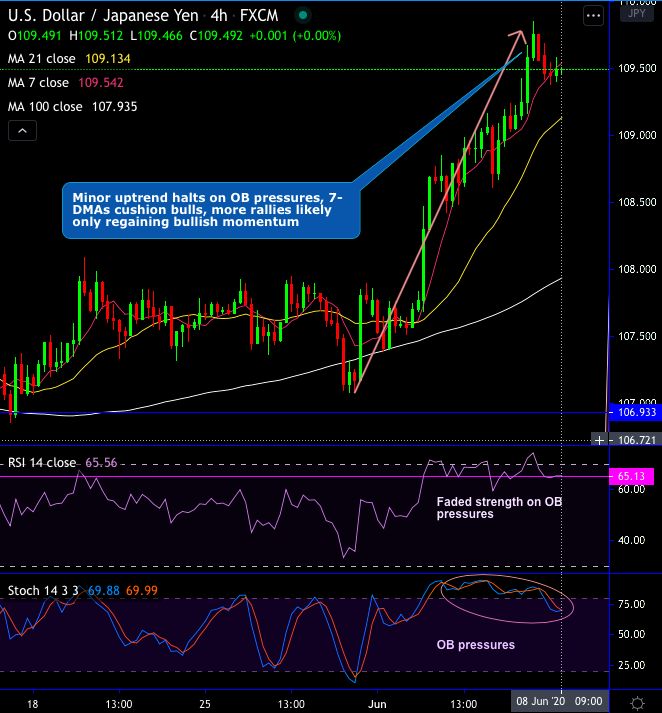 USDJPY’s bears are still hovering at 7-DMAs on overbought pressures, as the minor trend still remains bullish bias (refer daily plotting), while the major trend is cushioned by 100-EMAs.