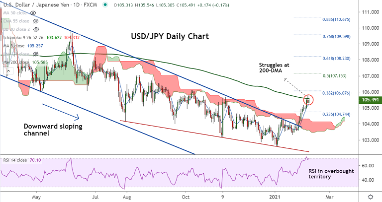 Breakout at 200-DMA will fuel upside in the pair, allowing test of 38.2% Fib at 106.07. Break below 5-DMA support will see dip till 110-EMA at 104.63.