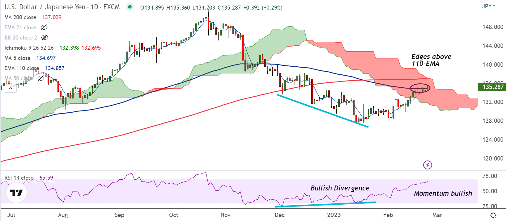 Summary: USD/JPY close above 110-EMA will see upside continuation. Next major resistance lies at 200-DMA at 137.02.