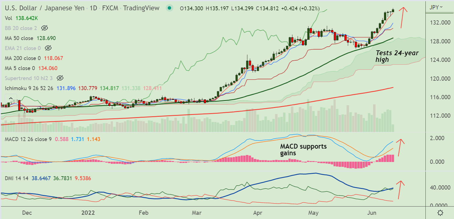 USD/JPY was trading 0.35% higher on the day at 134.84 at around 05:40 GMT. The pair broke above 135 handle to hit 24-year high at 135.19 before paring some gains.