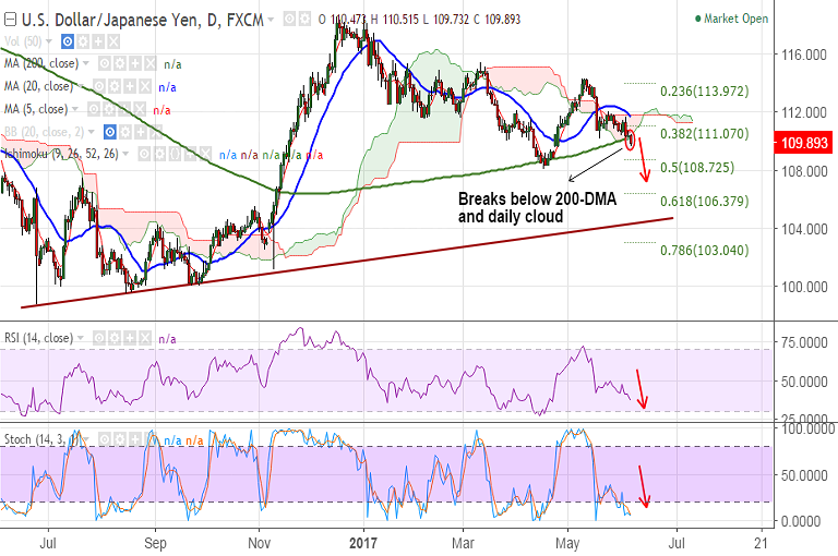 - USD/JPY broke below 200-DMA and hit fresh 6-week lows of 109.73, lowest level since April 25.