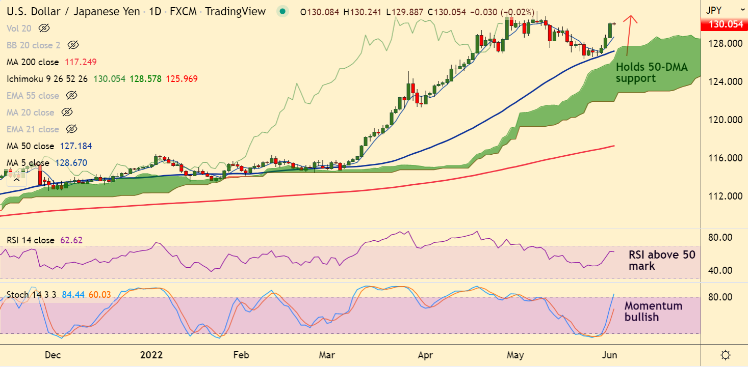 Summary: USD/JPY trades with a bullish technical bias. Pullback has bounced off 50-DMA support. Scope for retest of 131.34 ahead of fresh yearly highs.
