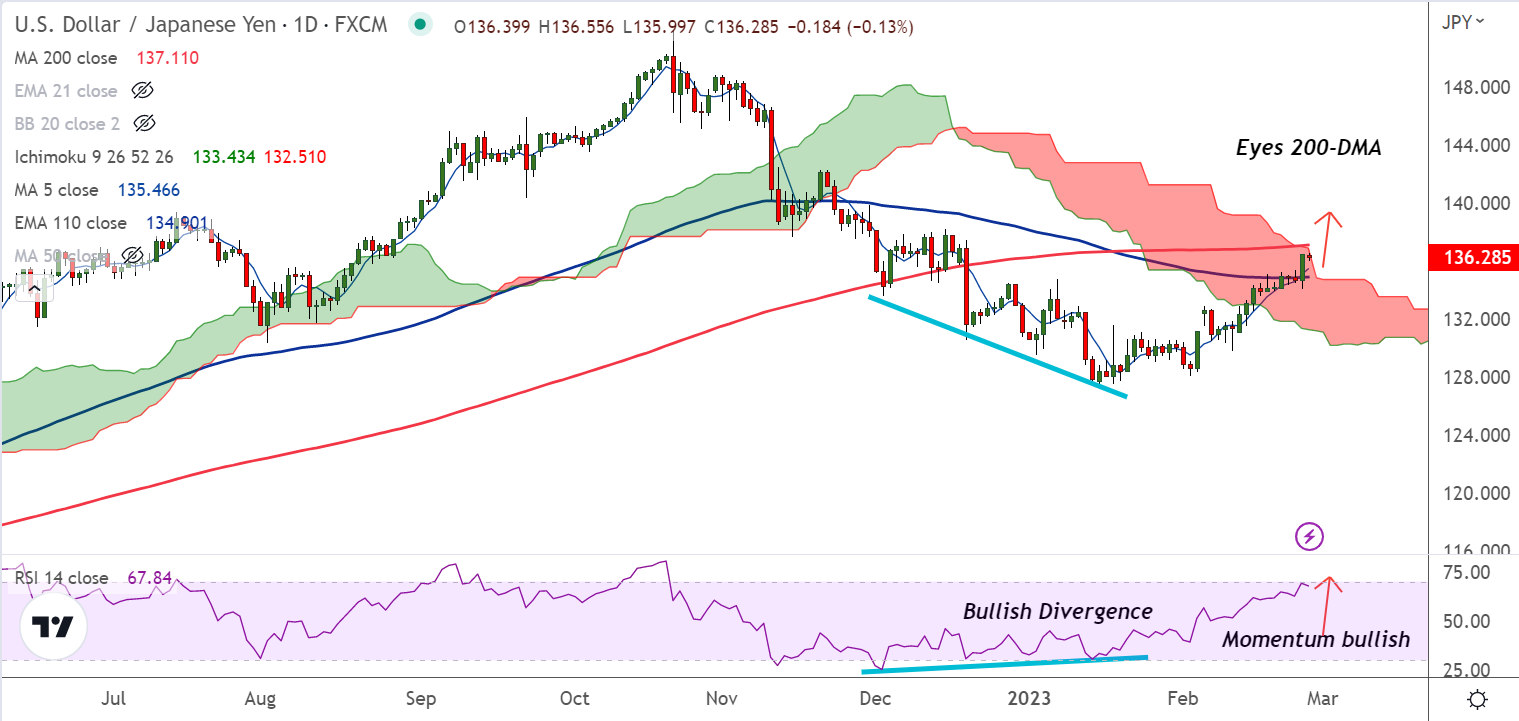 Summary: USD/JPY trades with a bullish bias. Watch for decisive break out at 200-DMA and cloud top for further gains.
