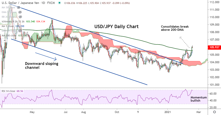 U.S. dollar spiked past 200-DMA on Tuesday's trade to close above 106 handle for the first time since Oct 2020.
