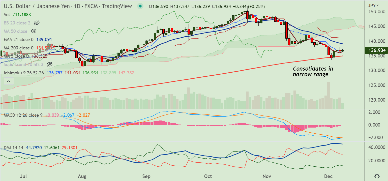 USD/JPY was trading 0.19% higher on the day at 136.84 at around 11:40 GMT. The major was extending range trade for the 3rd straight session.