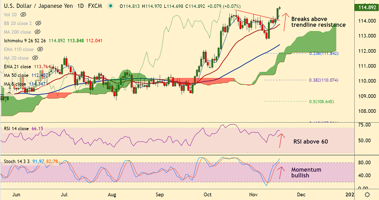 Summary: USD/JPY on track to close higher for the 4th straight month. The major is trading shy of 115 handle, outlook is bullish. Further upside on cards.