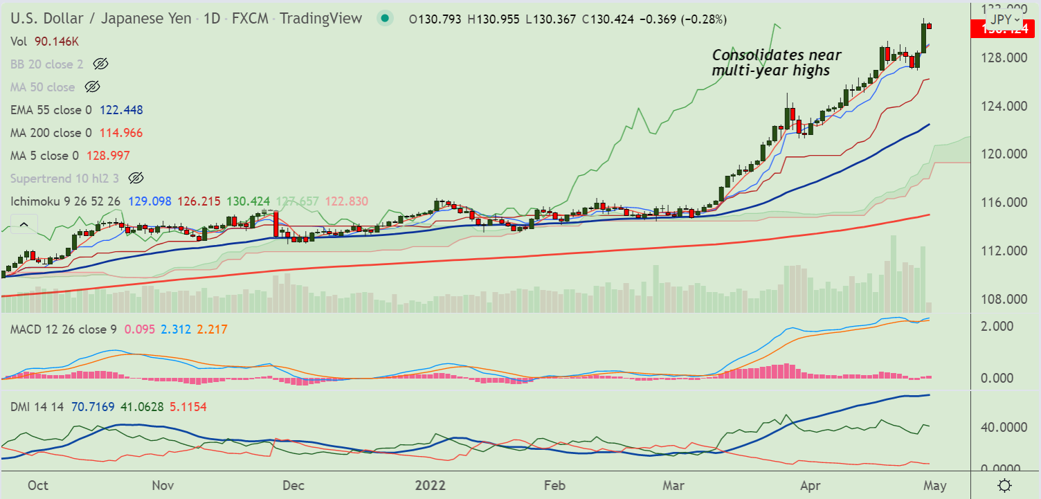 Summary: USD/JPY trades with a bullish bias. Pullbacks if any on account of overbought conditions are likely to be shallow. Scope for test of 135 levels.