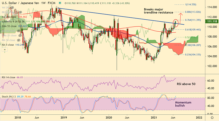 Price action has shown a decisive break above major trendline resistance. Technical bias is bullish. Scope for test of 76.4% Fib at 111.39.