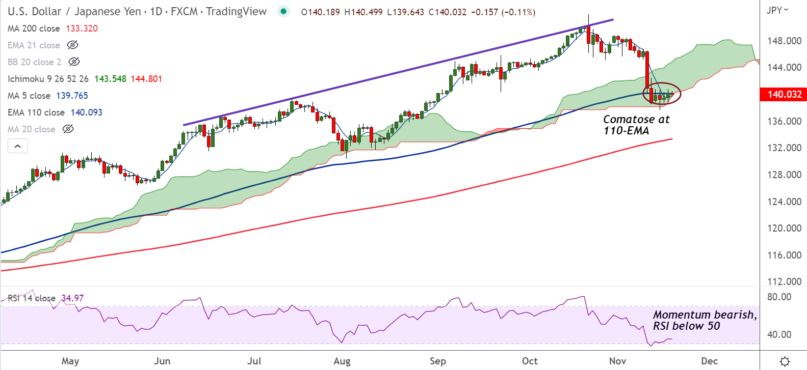 USD/JPY comatose above 140 mark, with session high at 140.49 and low at 139.64.