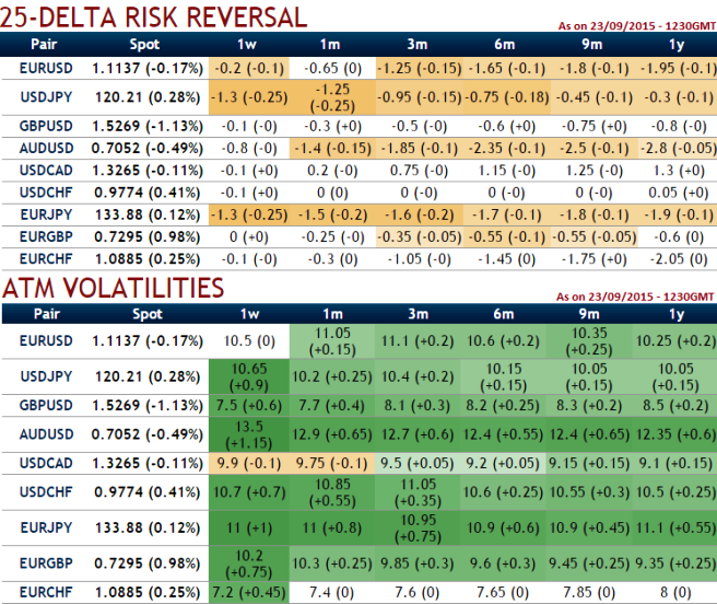 From the above table, we can observe that 1 week contacts have reduced implied volatilities after the much awaited last week's fed's meet which did not evidence any change in its rate policy, delta risk reversal for USDJPY is still highest negative values among entire G7 currency pool, this would mean that market sentiments for this pair have been bearish for this pair.