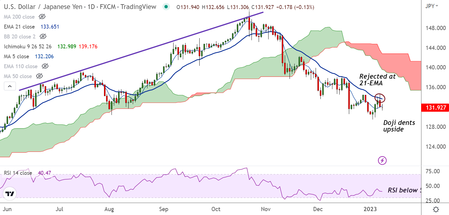 Upside price action in USD/JPY was rejected at 21-EMA, Doji formation on the daily candle at the time of writing suggests indecision.