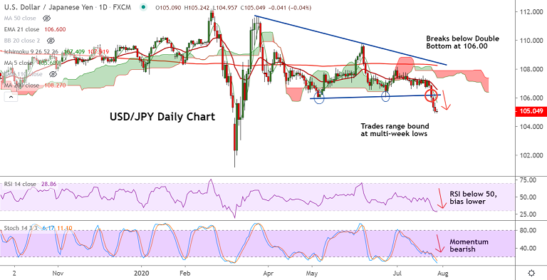 5-DMA is immediate resistance at 105.68. Decisive close above could see gains till 21-EMA. Bearish invalidation only above 200-DMA.