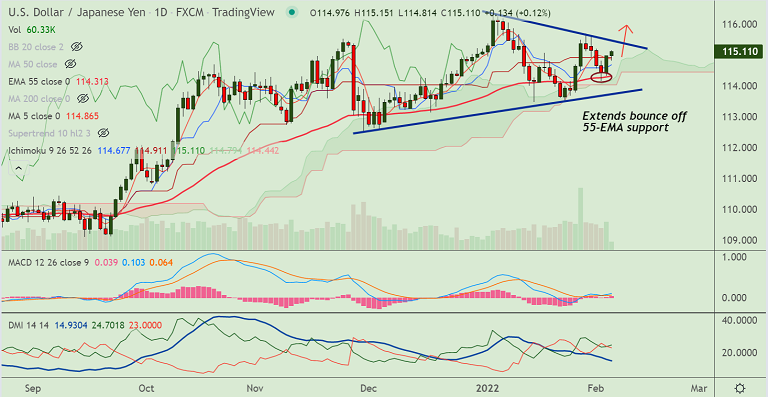 Technical analysis points to further upside in the pair. Next major hurdle lies at 115.50 (Trendline). Bullish invalidation likely below 55-EMA.