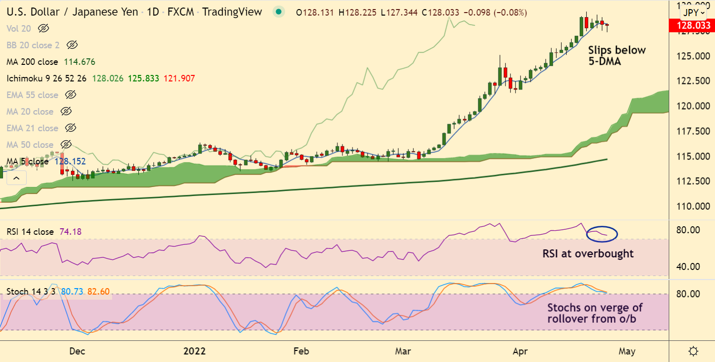 USD/JPY was trading largely unchanged at 128.11 at around 05:15 GMT, outlook is turning bearish.
