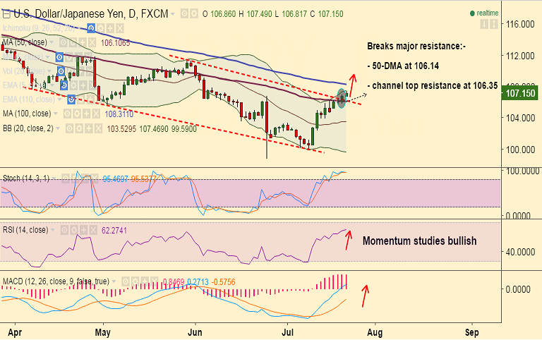 - USD/JPY upside breaks major resistances - 50-DMA at 106.14, channel top resistance at 106.35.