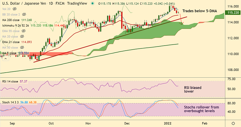 Summary: USD/JPY near-term bias has turned bearish. Dip till 21-EMA at 114.89 likely. Further weakness only on break below.