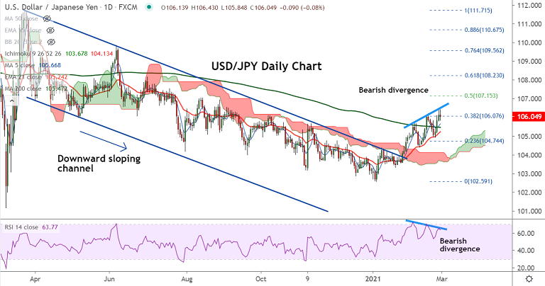 Bearish divergence on RSI keeps bias lower. Break below 200H MA could see test of 200-DMA at 105.47.