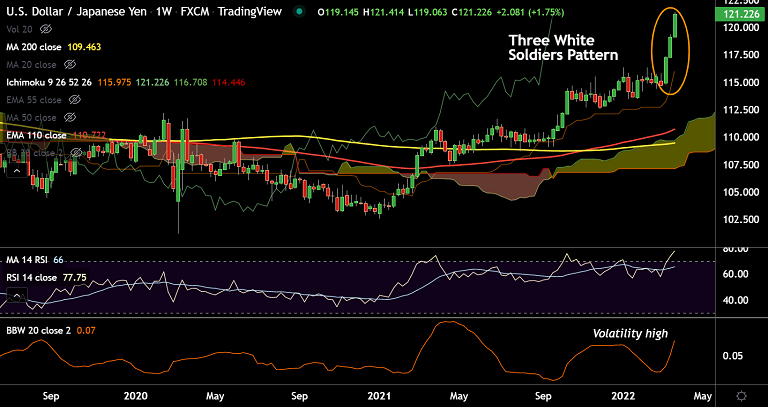 Summary: USD/JPY trades with a bullish technical bias. Oscillators are at overbought, but no signs of reversal seen. Scope for test of 122 levels.