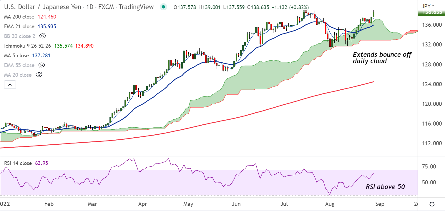 USD/JPY is extending bounce off daily cloud support. Technical indicators support further upside in the pair.