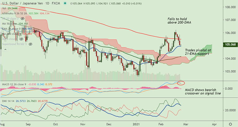 USD/JPY is extending the corrective pullback for the 5th straight session, trades pivotal at 21-EMA support.