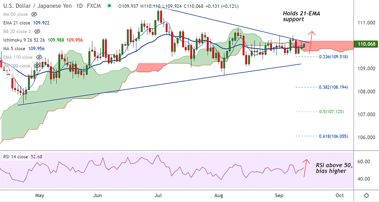 USD/JPY was trading 0.12% higher on the day at 110.06 at around 04:50 GMT. The major has resumed upside after Doji formation on Monday's candle.