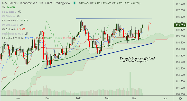 - The pair is extending bounce off 55-EMA and daily cloud support, rises for the 3rd straight session