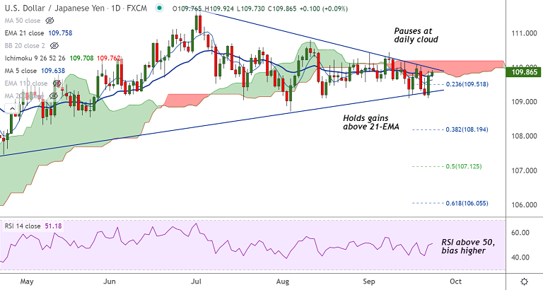 USD/JPY is holding gains above 21-EMA. Price action is testing cloud resistance and decisive break above will fuel further gains.
