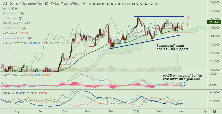 Support - 114.80 (55-EMA), Resistance - 116.30 (Trendline)