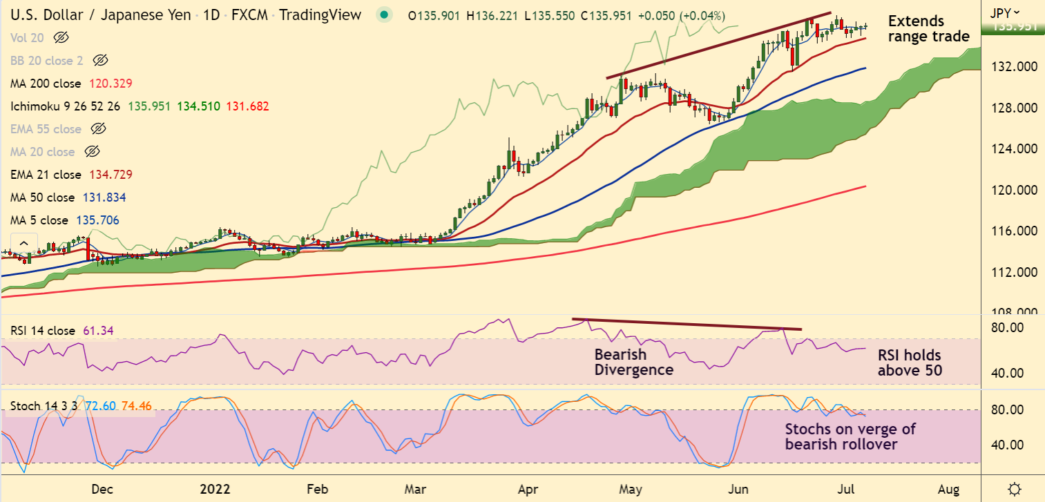 Support - 134.72 (21-EMA), Resistance - 137.28 (Upper BB)